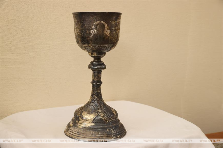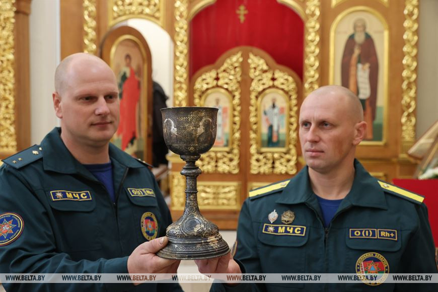 В Богоявленском соборе отслужили благодарственный молебен, после которого найденную ценную чашу епископу Полоцкому и Глубокскому Игнатию передал председатель Витебского облисполкома Александр Субботин. Епископ сообщил, что найденную чашу восстановят, а затем будут использовать при крещении младенцев и причастии. Он передал спасателям и представителям областной и районной власти иконы, которые будут охранять их на жизненном пути.-0-