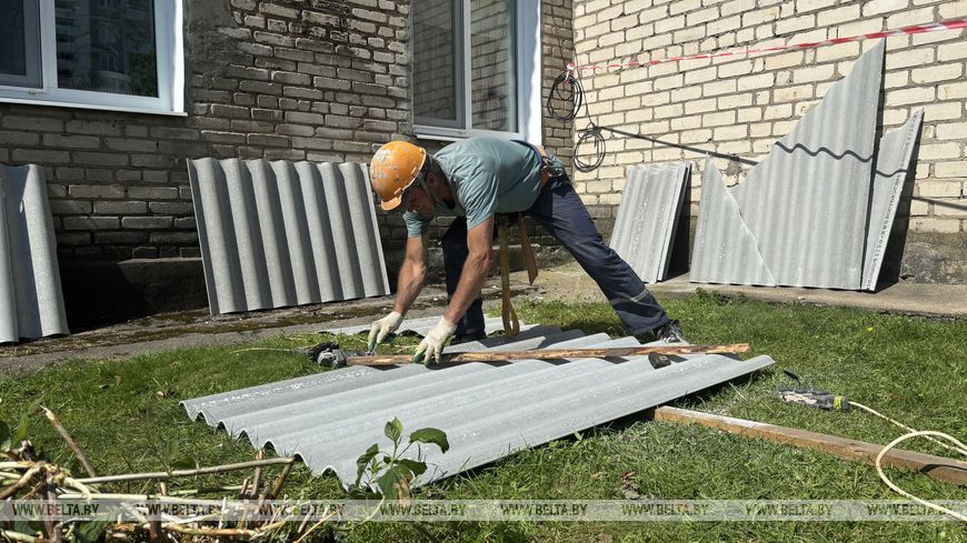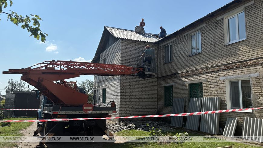 Продолжаются в Могилеве ремонты поврежденных кровель. Бригада ЖРЭУ Октябрьского района перекрывает крышу четырехквартирного дома на улице Южной. "Я в этом доме проживаю уже около 35 лет, у нас тут тихо и спокойно всегда. Ночью 10 июля, когда нас накрыла гроза, очень испугалась, даже окна не успела закрыть. Дома мы были только с дочкой, было очень страшно. В окне увидела, что летит крыша, - поделилась жительница одной из квартир Ольга Королева. - После бури вышли на улицу, вместе с соседями оценили ущерб. Крыша дома завалила машину, двор, по соседям ее раскидало. Деревья тоже повалило".