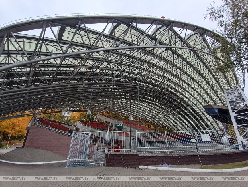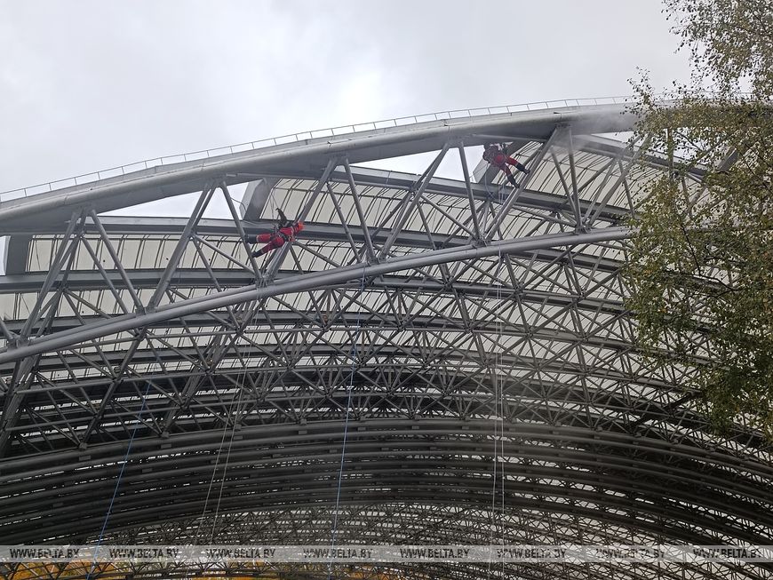 По словам заведующего филиалом, для определения состояния крыши над зрительным залом проводилось экспертное обследование. В результате от замены поликарбонатного покрытия козырька, что было задумано изначально, отказались. Вместо этого промышленные альпинисты из новополоцкой строительной компании взялись за гидроструйную очистку. Первые дни работы показали хороший результат, крыша стала светлее. После очистки на нее нанесут специальное защитное покрытие, которое продлит срок службы на десятки лет. Общая площадь поликарбонатной крыши составляет около 5 тыс. кв.м.Также до морозов новополочане планируют завершить очистку и покраску всех металлоконструкций, которые поддерживают купол Летнего амфитеатра, а это примерно 30 тыс. кв.м. Строители рассказали, что новая краска выдержит морозы до 40 градусов, так что прослужить она должна долго.