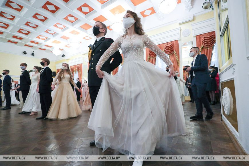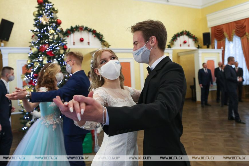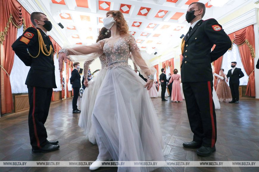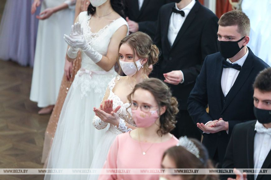 По давнему бальному этикету праздник открыл торжественный танец-шествие - полонез. Отдавая дань респираторному этикету, пары были в масках. "Жаль, конечно, что она скрывает красоту. Но с другой стороны, я очень рада даже в таких условиях побывать на этом замечательном мероприятии", - поделилась впечатлениями студентка пятого курса Ксения Кнышова.