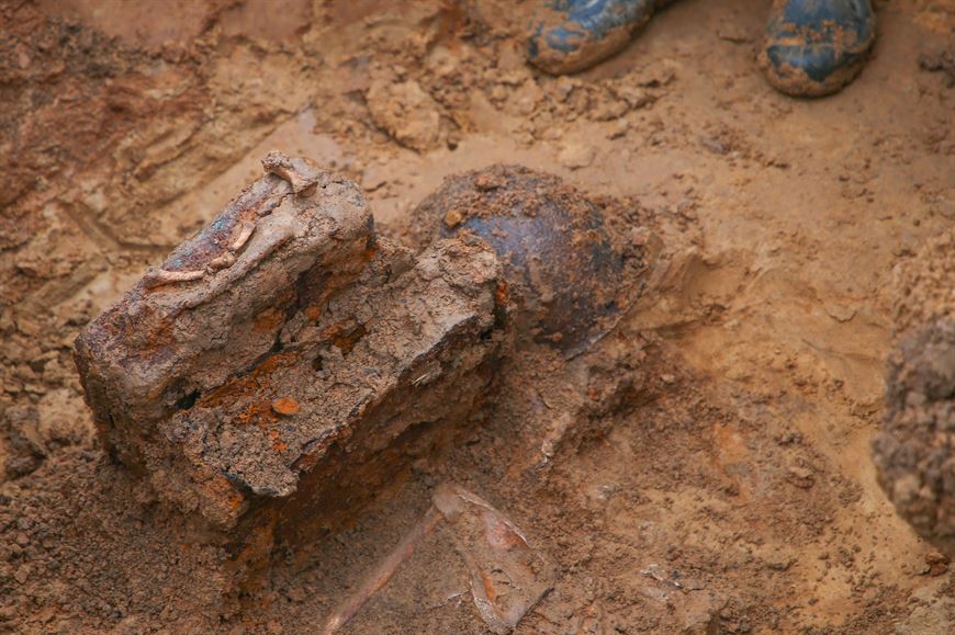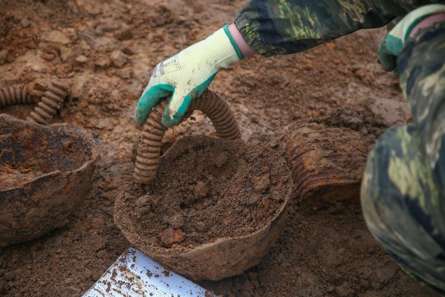 Основные поисковые работы проходят на поле у мемориала, всего в 150 м от него. Через несколько часов после начала раскопок под проливным дождем поисковики обнаружили первые находки: подняли останки пяти бойцов. А кроме этого, каски советского образца, штык от винтовки, ящики от патронов и многое другое.