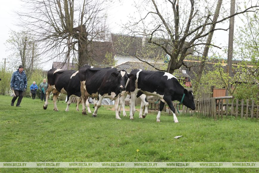 Спустя несколько минут где-то за высоким забором началось движение и на всю улицу раздалось протяжное приветственное: "Муууу….". К нему подключились еще пару таких же голосов. Несколько ворот с лязгом распахнулись и на улицу неспешно вышли пестрые буренки, подгоняемые своими хозяевами. Вот и начало Юрьева дня - почитаемого в народе праздника, традиции которого чтят и берегут в Могилевском районе.
