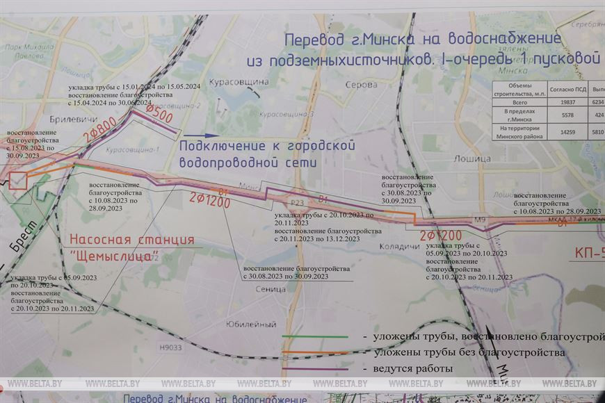"Работы ведутся достаточно активными темпами. После завершения подготовительных работ мы приступили непосредственно к строительным. В первую очередь строили водоводы. С момента начала строительства освоено около Br120 млн. В настоящее время мы выполняем укладку водоводов больших диаметров, проводим работы по перебуриванию скважин. Трудятся несколько подрядных организаций. Все работы выполняются по графику. Многие из них - стройка магистральных и сборных водоводов, перебуривание скважин - проводятся одновременно", - прокомментировал ход работ директор УП "Минскводоканал" Федор Римашевский.