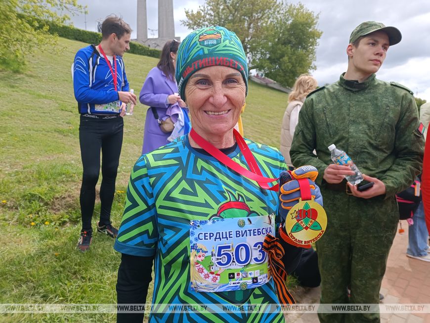 Любители активного отдыха присоединились к тематическому атлетическому забегу "Сердце Витебска". Среди участников оказалась уроженка областного центра, а сейчас жительница Москвы Наталья Терентьева. В номинации "60+" она стала самой возрастной. "Бегом занимаюсь с 10 лет. С большим удовольствием уже второй раз участвую в таком забеге. На День Победы всегда приезжаю в родной город. Здесь все так по-домашнему, свое, милое сердцу", - призналась она.