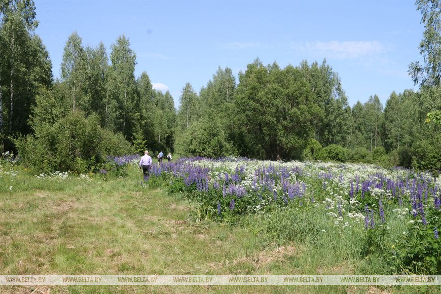 И вот мы добрались до большого деревянного креста и таблички, которые установлены на когда-то центральном въезде в деревню. Табличка гласит, что на этом месте была деревня Березка, сожженная фашистами в июне 1943 года, а еще "Даруйце, людзі добрыя, за тое, што вас не сустракаем, як гасцей". Эта фраза почему-то заставляет оглянуться по сторонам, словно убедиться, что встретить нас некому. За эти годы к бывшей деревне уже практически вплотную подступил лес, вокруг целыми полями цветут люпины. Утопает в зелени и сама Березка.