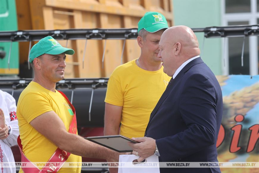"Это первые шеститысячники в нашей республике. Предприятия Минского региона первыми сделали ставку на такую сложную энергонасыщенную технику, и она себя оправдала. Но техника без человека мертва, поэтому хочется высказать слова благодарности комбайнерам, которые продемонстрировали настоящий профессионализм и доказали, что техника в умелых руках вдвойне мощна и эффективна. Спасибо вам от лица всего коллектива нашего предприятия", - обратился к комбайнерам генеральный директор ОАО "Гомсельмаш" Александр Новиков. Он вручил Сергею Максимцу и Василию Зуру подарки от предприятия.