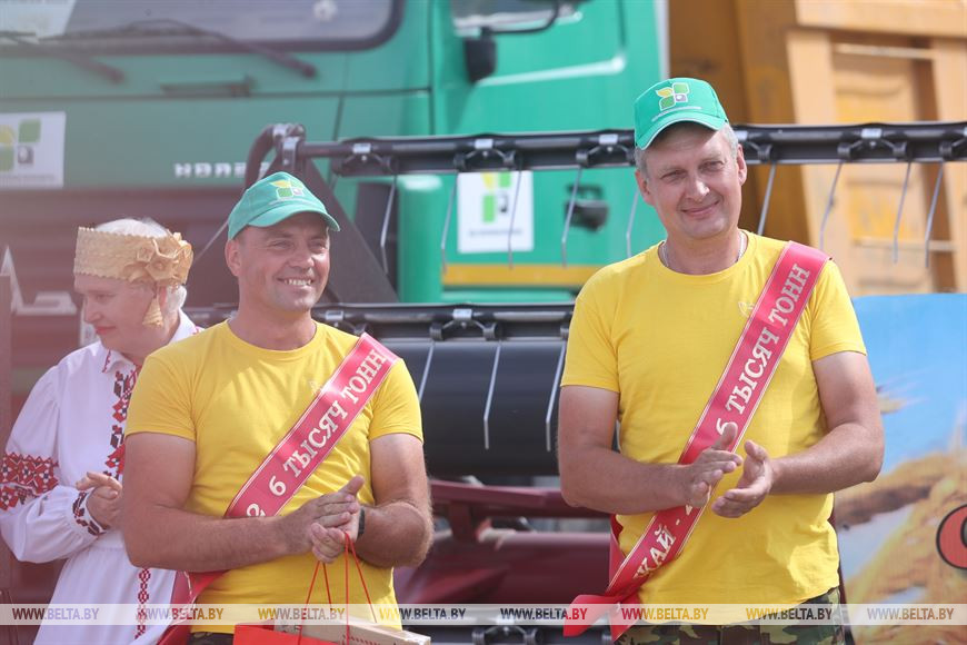 Сегодня на мехдворе ОАО "Крутогорье-Петковичи" в Дзержинском районе чествовали комбайнеров Сергея Максимца и Василия Зура, которые первыми в Беларуси намолотили 6 тыс. т зерна. Рекордного результата передовики достигли на отечественном комбайне КЗС 21-24 КР "Гомсельмаша". Поздравить экипаж с рекордным намолотом приехал председатель комитета по сельскому хозяйству и продовольствию Миноблисполкома Василий Сысоев.