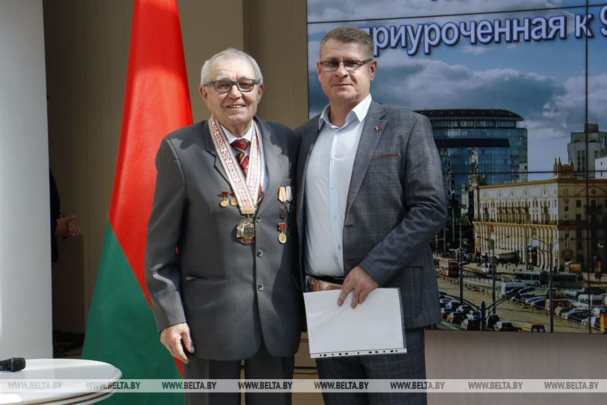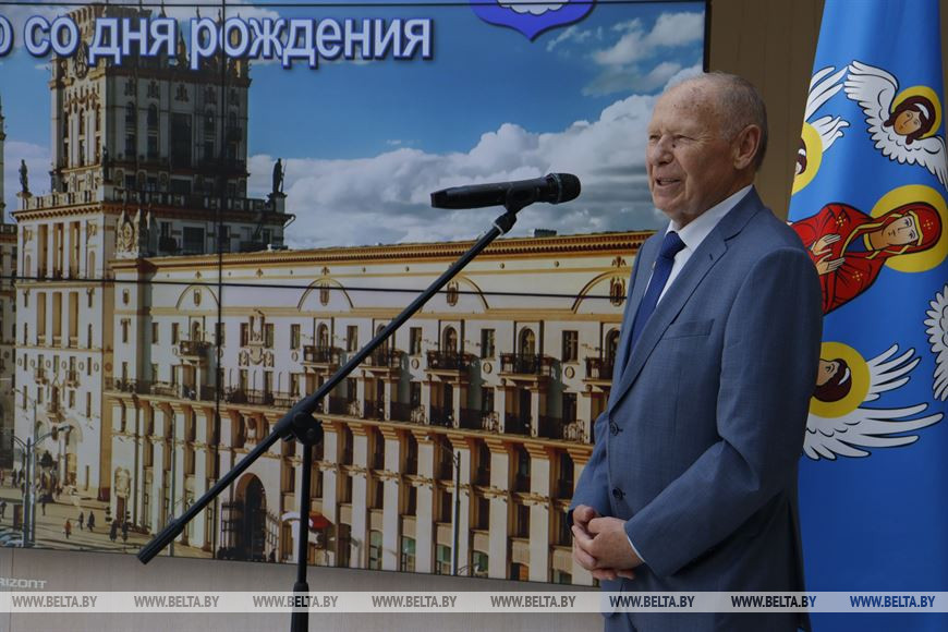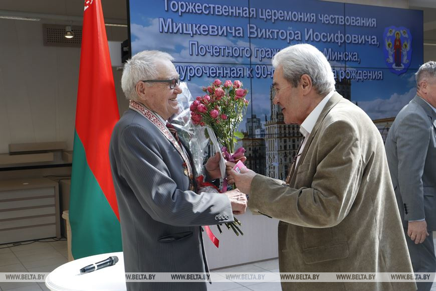 24 мая, Минск /Корр. БЕЛТА/. В Минской городской ратуше прошла торжественная церемония чествования почетного гражданина Минска Виктора Иосифовича Мицкевича по случаю его 90-летия, передает корреспондент БЕЛТА.