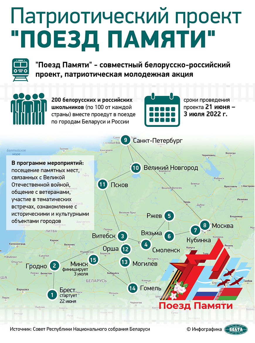 Проект "Поезд Памяти", посвященный Великой Отечественной войне и Году исторической памяти в Беларуси, инициирован главами верхних палат парламентов Беларуси и России - председателем Совета Республики Национального собрания Беларуси Натальей Кочановой и спикером Совета Федерации Федерального собрания России Валентиной Матвиенко. Он стартовал 22 июня в Бресте и завершится 3 июля в Минске. Его маршрут включает 15 городов Беларуси и России, а участниками его стали 200 белорусских и российских старшеклассников.-0-