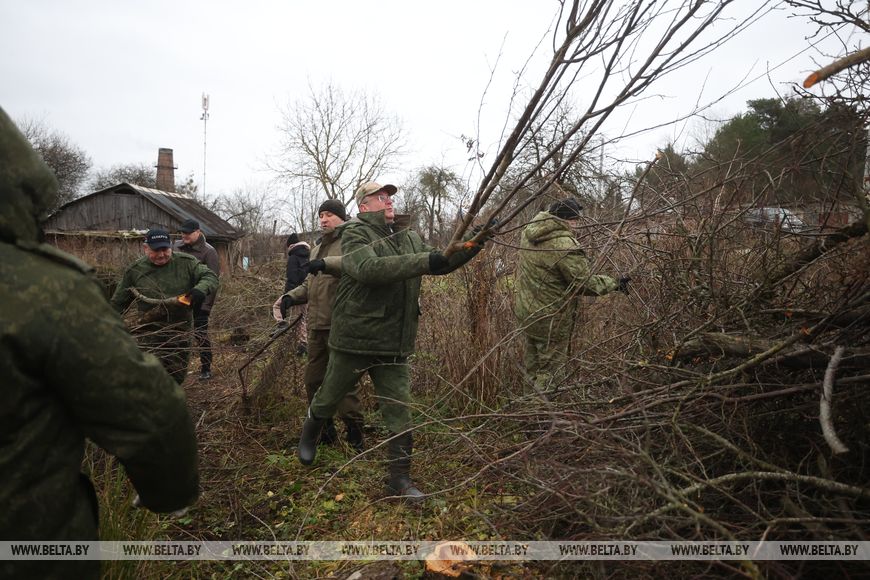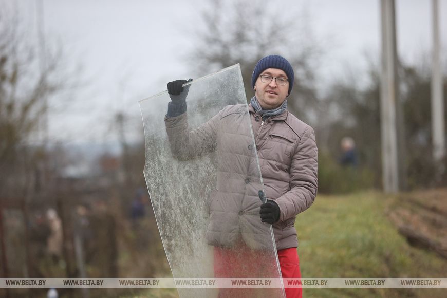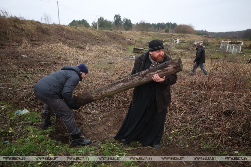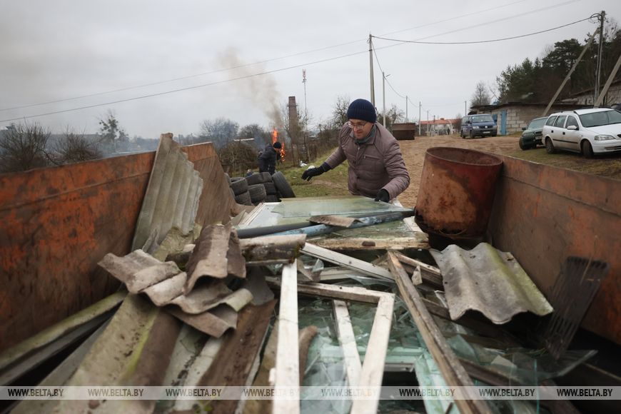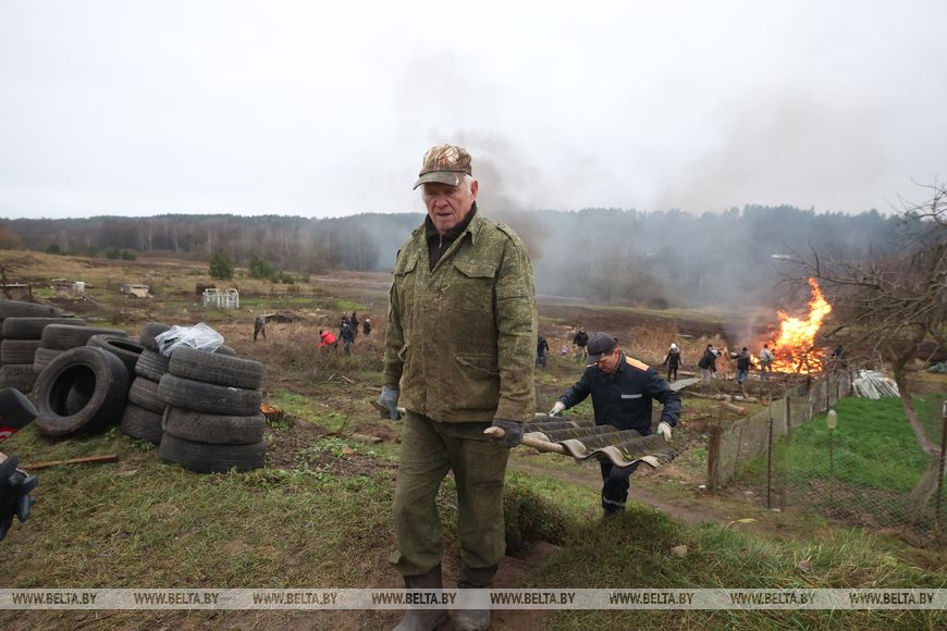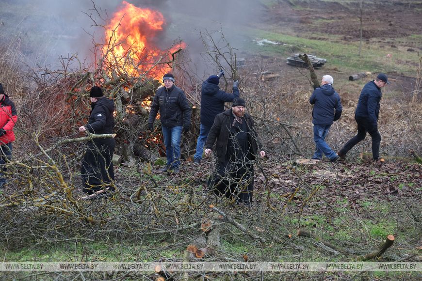 В агрогородке трудовой десант был занят и во время республиканского субботника в октябре. Сегодня работы развернулись на неприглядном участке на окраине населенного пункта, где раньше были самовольно сделанные огороды, возведены хозпостройки. Трудовой десант, а это представители Гродненского облисполкома, Слонимского райисполкома, представители духовенства и местные жители, расчищали территорию, разбирали ветхие хозяйственные постройки.