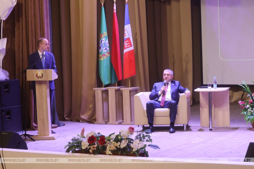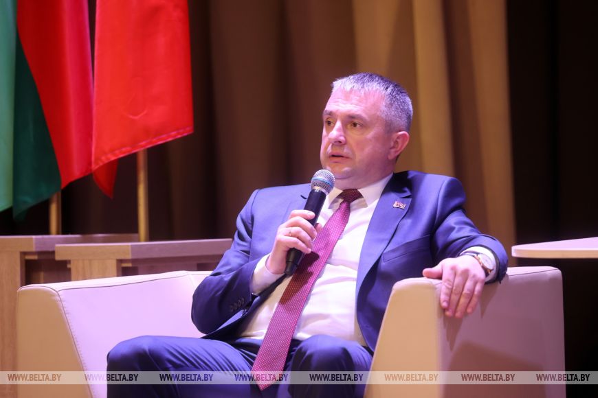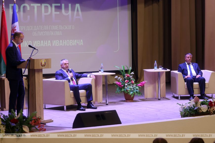 В диалоге с главой региона молодежь интересовалась, какая продукция гомельских производителей пользуется наибольшим спросом. Иван Крупко отметил, что сегодня стоят очень серьезные задачи перед каждым предприятием. "Ведь из объема продукции, которую мы производим, около 60% продаем почти в 100 стран. Против нас, надо сказать открыто, ввели незаконные санкции, нарушив все логистические пути. Поэтому наша задача - разработать логистические цепочки и в странах-партнерах найти те направления, по которым мы сегодня имеем возможность продать нашу качественную, безопасную и конкурентоспособную продукцию", - подчеркнул председатель облисполкома.Спектр продукции, востребованной в разных точках мира, очень большой. "Чтобы устойчиво развиваться, нужен объем реализованной продукции. Мы работаем в тех направлениях, в тех странах, где мы можем конкурировать. Задача внутри - модернизироваться и быть на шаг впереди, чтобы быть конкурентоспособными. Есть три важные составляющие - качество, безопасность и конкурентоспособность. Тогда мы устойчивы на рынке", - убежден председатель облисполкома.