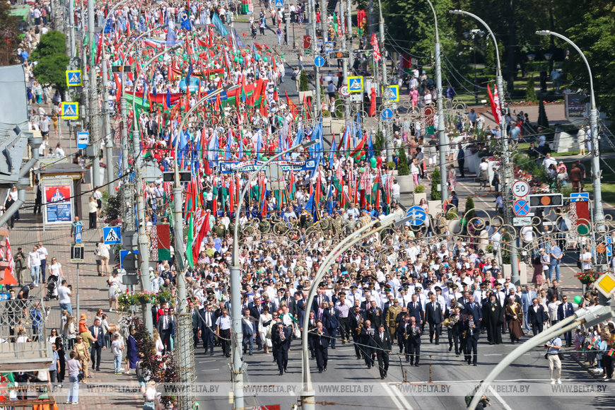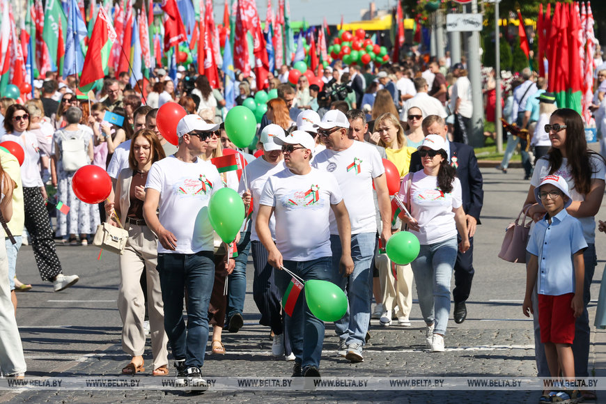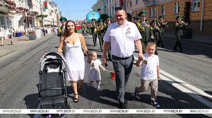 "Сегодняшний праздник - это и 81-я годовщина освобождения Беларуси от немецко-фашистских захватчиков. Мой прадедушка воевал, был радистом. У него есть награды. Благодаря поисковому сайту мы узнали его боевой путь, потому что сам он у нас был очень стеснительный, мало рассказывал о тех страшных временах", - поделилась участница шествия.