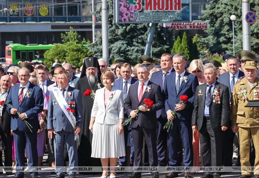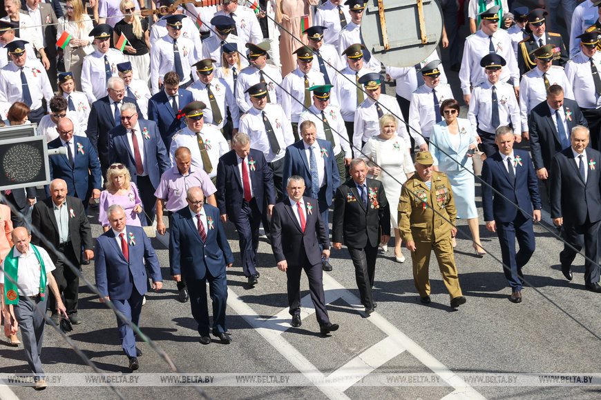 В единой колонне ветераны, руководство области и города, парламентарии, почетные жители региона, представители трудовых коллективов, общественных организаций, политических партий, интеллигенция, спортсмены, молодежь прошли от площади Восстания до площади Труда.
