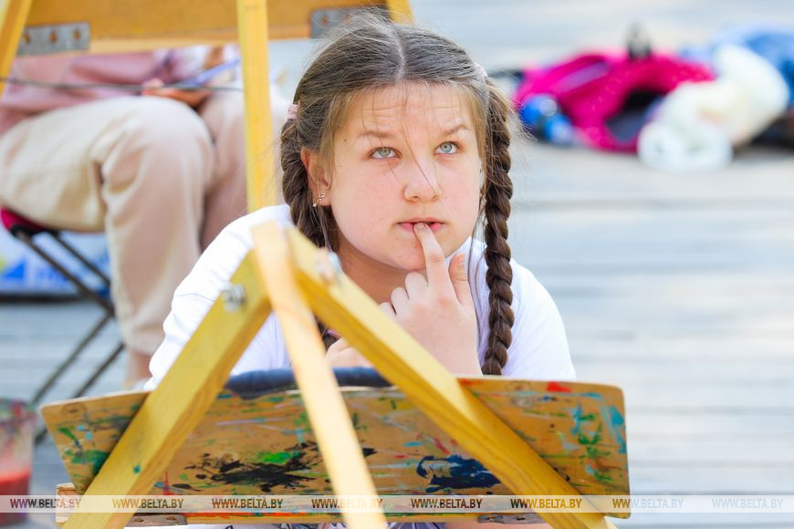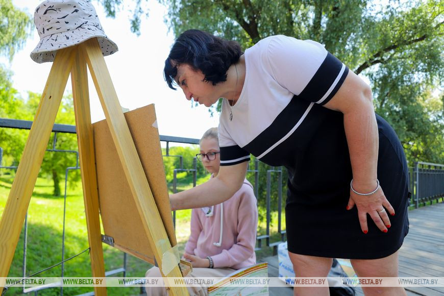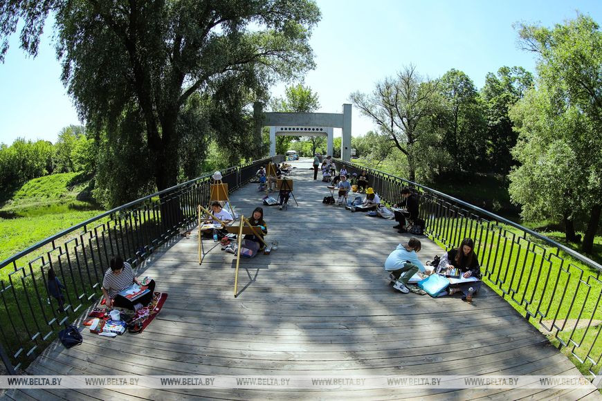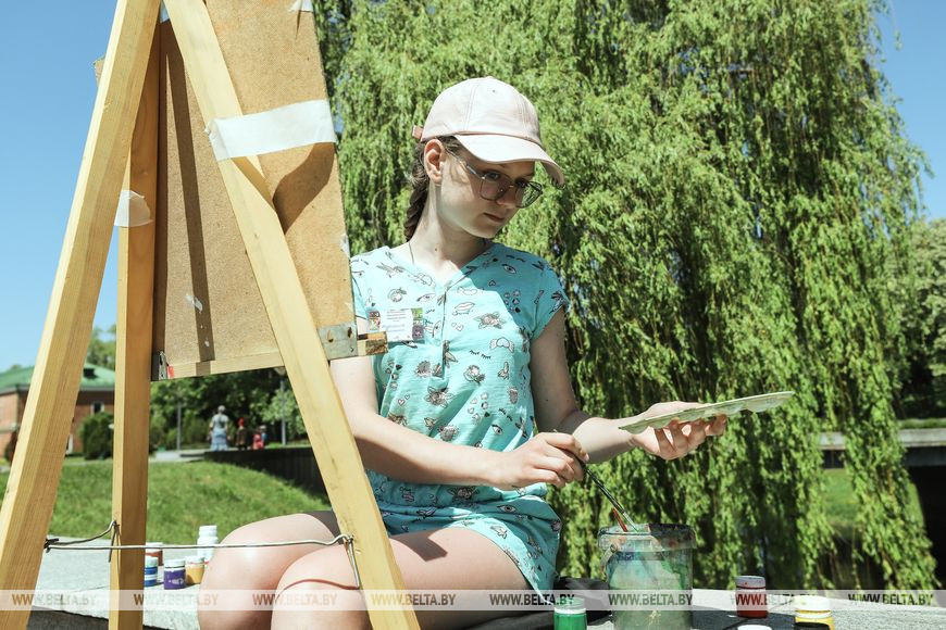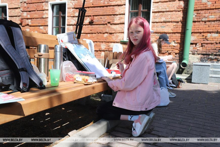 Пешеходный мост с внешней стороны Холмских ворот сегодня напоминал знаменитый Карлов мост в Праге. Его тоже заняли художники. Ученица Клейниковской детской школы искусств София Шепталова пока в начале творческого пути. "Интересно рисовать на природе. В Брестской крепости была и с родителями, и на экскурсии, но рисую здесь первый раз. Это мой первый пленэр. Хочу постараться передать всю окружающую красоту", - сказала 11-летняя школьница.