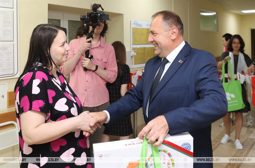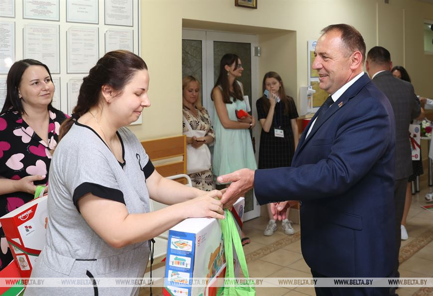 Сергей Бартош, а также заместитель председателя облисполкома Дмитрий Алейников, председатель областной организации РОО "Белая Русь" Галина Терещенко вручили мамам и их деткам подарки.