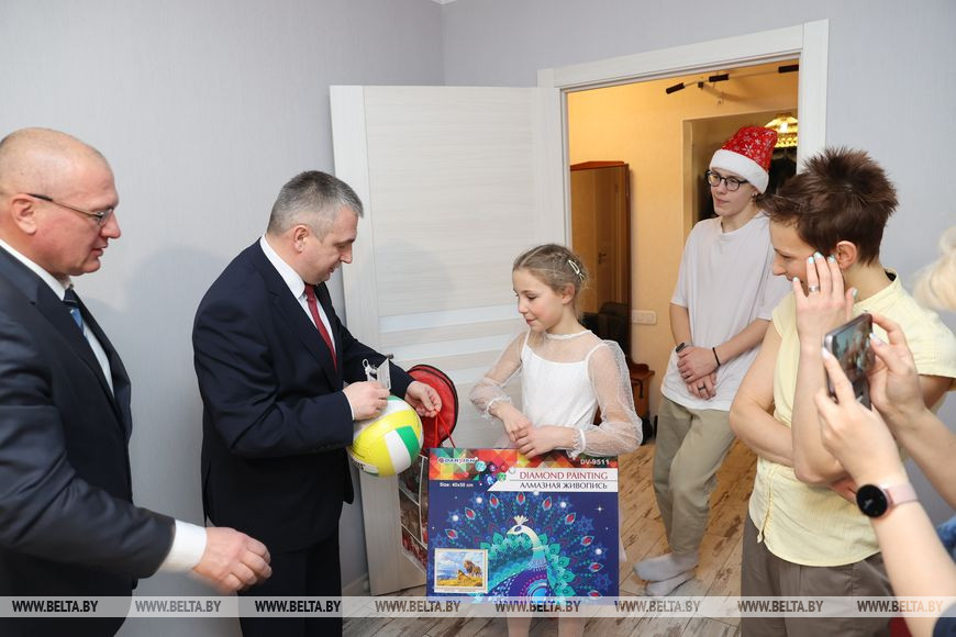 29 декабря, Гомель /Корр. БЕЛТА/. Председатель Гомельского облисполкома Иван Крупко поздравил сегодня в Гомеле с наступающим Новым годом многодетную семью Александры Виниченко и Игоря Юрлова, передает корреспондент БЕЛТА.