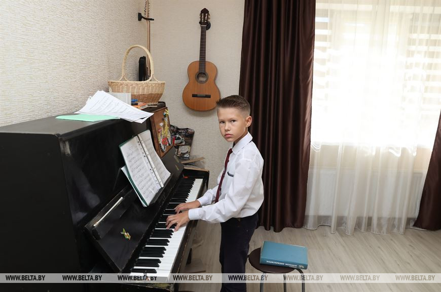 И хотя собрать всю семью вместе непросто, застаем всех дома, буквально на несколько минут для съемки. Студент Гомельского государственного университета имени П.О.Сухого Александр также приехал домой из Гомеля. В просторном зале Арсений играет на фортепиано. Патриотическую песню - хор "Славься!" - на музыку композитора Михаила Глинки из оперы "Иван Сусанин" парни исполнят в четыре руки. А пятилетний Артемий практикуется в знании букв.