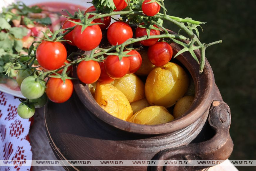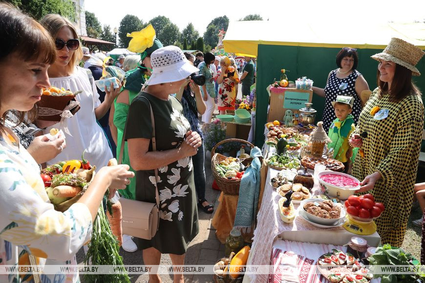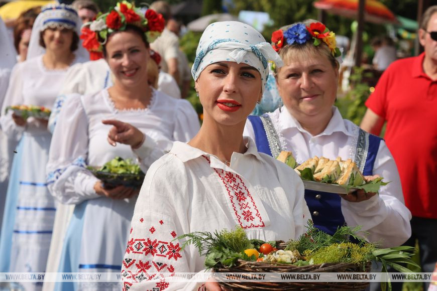 После открытия все направились в зону праздничного гастрофеста - тематические площадки, торговые ряды и подворья наполнились музыкой и оживленной беседой. Посетители Дня огурца пробовали разносолы, удивляясь уменьям и способностям шкловских хозяюшек, а те, в свою очередь, весело зазывали к себе гостей и от души потчевали своими кулинарными находками. Примечательно, что огуречная тематика и желто-зеленая цветовая гамма присутствовала здесь во всем - костюмах, оформлении палаток и даже украшениях. Например, у многих на груди красовались огуречные бутоньерки.