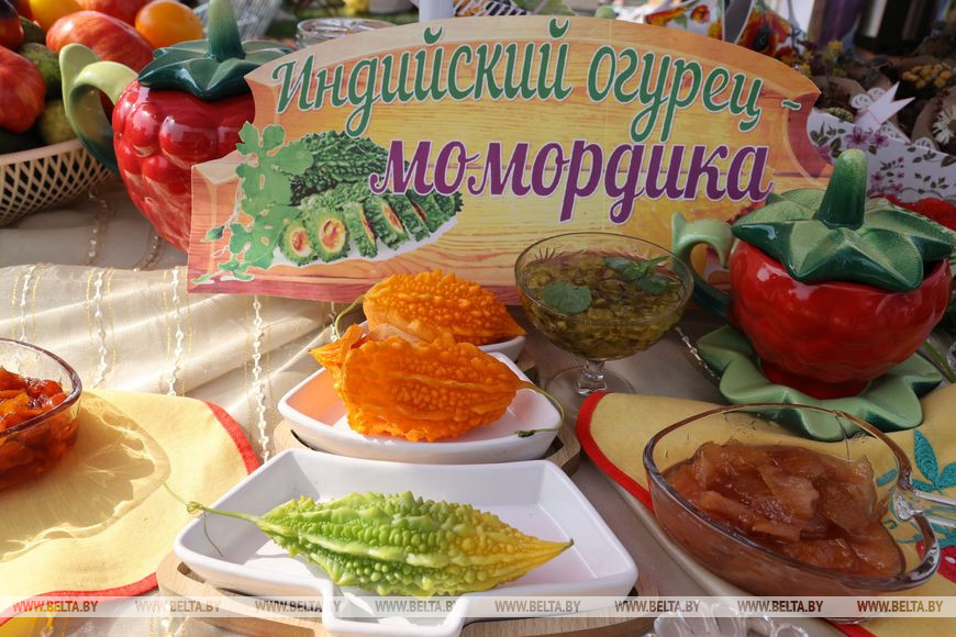 Останавливаюсь возе 6,5-метрового огуречного бутерброда. "Подавайте сюда повара", - требую у девочек в ярких праздничных нарядах. "Это наш эксклюзивный огуречный бутерброд - самый длинный и вкусный, - улыбается руководитель народного любительского коллектива "Флориада" при Шкловской центральной библиотеке Ирина Селедцова и тут же шутит: - Линейку дать, измерять будете? Наши работницы, кулинары и мастерицы готовили его целую ночь. Он очень разнообразный - есть и огурчик, и помидорчик, и перчик, и щепотка хорошего настроения. Но это не единственный наш сюрприз. Специально для праздника мы вырастили экзотический индийский огурец момордику, созревший плод которого имеет насыщенный оранжевый окрас".