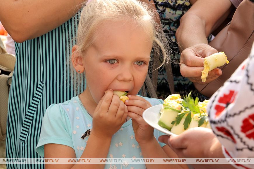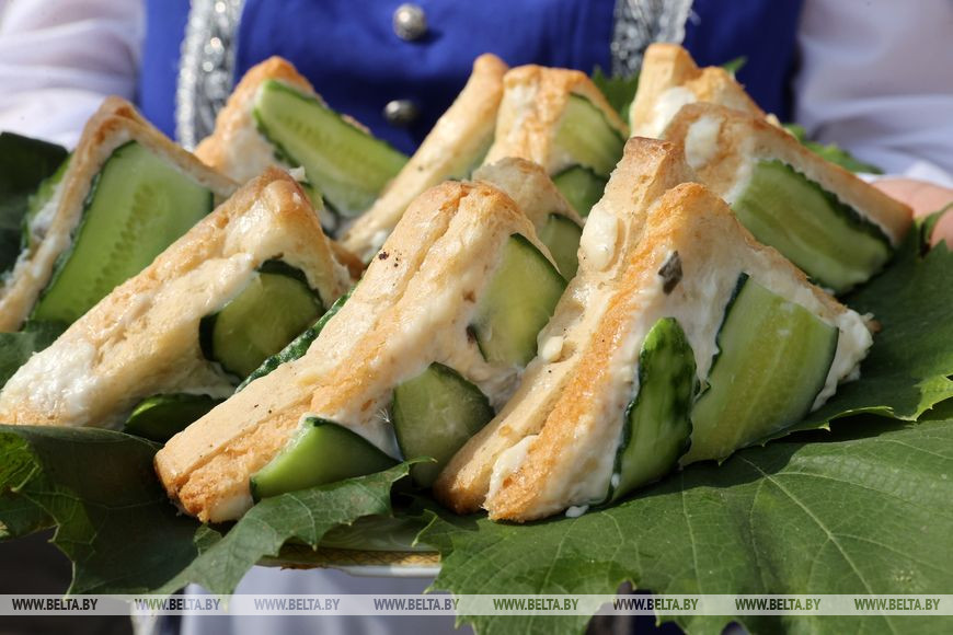 На больших сервировочных тарелках хозяюшки выносили зрителям ароматные яства и всяческие огуречные "прысмакi", которыми можно было накормить приличную свадьбу. Огурцы с луком, овощные бутерброды, огуречные закуски, тарталетки и канапе со свежим огурцом, кабачача… И это лишь малость кулинарных изысков. К слову, после презентации гости смогли оценить огуречную красоту еще и на вкус, а с особо настойчивыми даже поделились рецептом приготовления этих блюд.