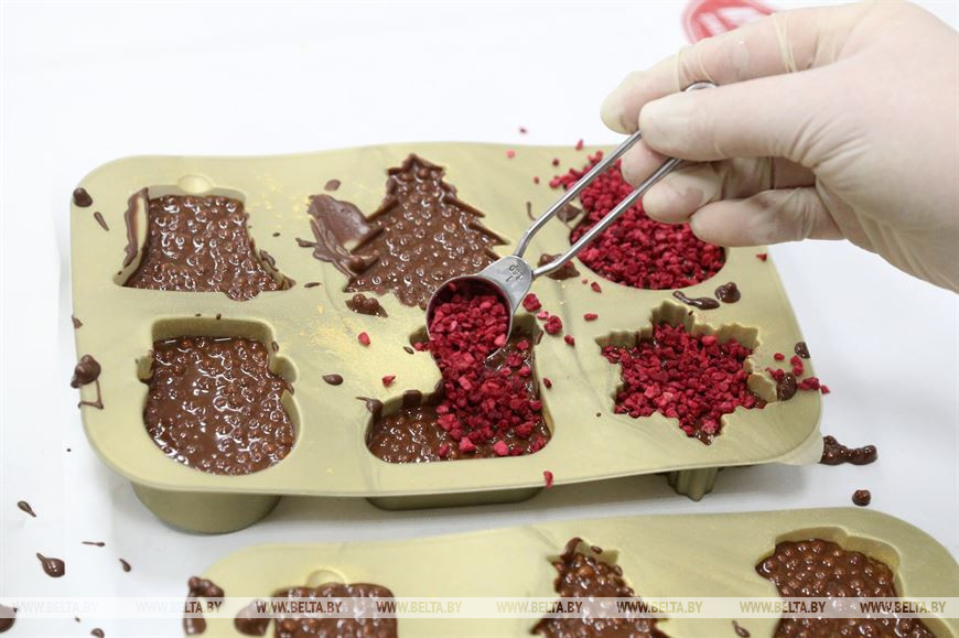 "Сверху он получается золотой, а снизу из-за ягод - красный. Настоящие новогодние цвета. Теперь готовый шоколад можно поместить в индивидуальные упаковки и отправлять на продажу", - отметила Марина Исакова.