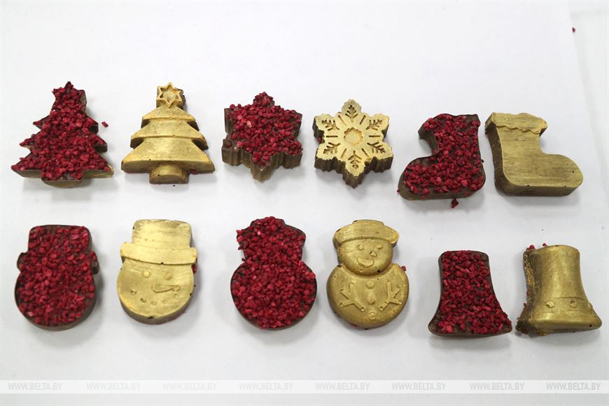 "Это небольшие плитки шоколада в форме снеговичков, елочек, снежинок, звездочек. Каждая шоколадка создается вручную при строгом соблюдении всех необходимых технологических требований. При изготовлении используем рисовые шарики, взрывную карамель и сублимированные ягоды", - рассказала Лилия Новаковская.