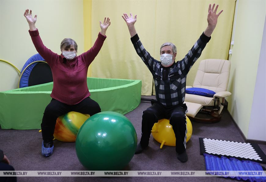 После тренировок каждый может также пройти диагностику на специальном аппарате, который суммирует показатели тонометра, пикфлоуметра, веса, ростомера и выдает заключение о состоянии здоровья. Этот аппарат был разработан российским профессором кафедры "Биомедицинской безопасности" МГТУ им.Баумана и любезно предоставлен в безвозмездное пользование ТЦСОН Витебского района. Теперь прибор служит жителям агрогородка как верный помощник и страж их здоровья. В отделении специалисты также измеряют у своих подопечных уровень кислорода и сахара в крови. Районный центр соцобслуживания и отделение социальной реабилитации в частности активно сотрудничают с преподавателями кафедры физической реабилитации Витебского государственного медицинского университета. Они оказывают консультативную помощь и проводят обучение специалистов по правильному оказанию услуг, в том числе в условиях COVID-19.