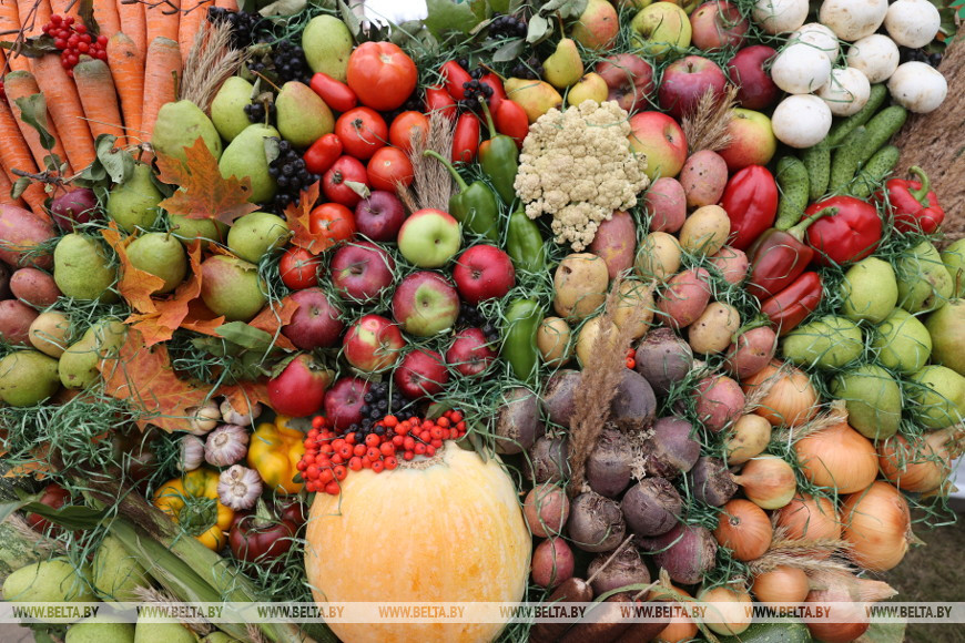 Как известно, есть круговорот жизни, а на "Дажынках" создали колесо овощей, идеально подходящих, за малым исключением, для борща. Красивая кругленькая капусточка так и просилась, чтоб ее нашинковали, добавили в кастрюльку с мясным наваристым бульоном, где уже ожидают кубики картошки, кружочки морковочки, а на сковородке ко всей этой компании дополнительно зажариваются лучок да "бурачок". Хотя красивый, весь в розовых прожилочках, смачный кус сала, что я заметила недалеко, и не относился к "борщевой корзине", от его добрососедства любимое в народе первое блюдо только выиграло бы. А желудок даже заядлого гурмана за такую радость для него только спасибо сказал бы.
