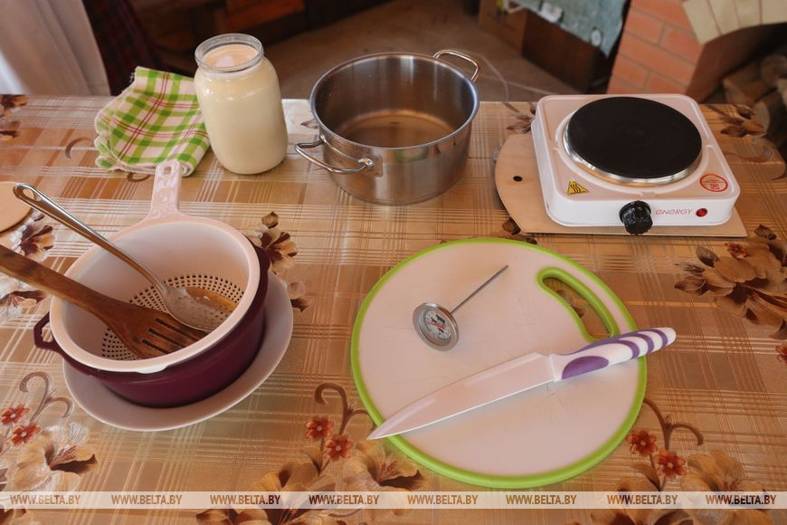 Тем временем начинается наш мастер-класс. На столе появился литр молока, электрическая плитка и кастрюля. Молоко нужно нагреть до 90 градусов. Хозяйка подчеркивает, что очень важно соблюдать температурный режим. После того как молоко разогрето, в него добавляют специальную закваску.