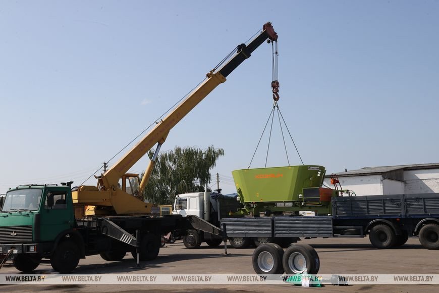 Бригада с интересом наблюдает за разгрузкой нового агрегата - смесителя-раздатчика. "Всегда приятно, когда в парке появляется новая техника. Каждый современный агрегат позволяет автоматизировать процессы. В сельском хозяйстве это особенно ценно", - поясняет парень.