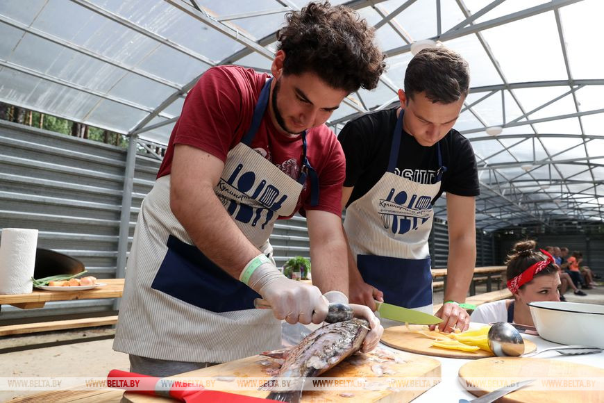 Еще один традиционный для фестиваля конкурс - приготовление ухи и блюд из рыбы. Место приготовления в фестивальном городке можно определить по приятному аромату, главное не перепутать его с шашлыком. Один из постоянных участников конкурса - Белорусский государственный университет пищевых и химических технологий. "Наши студенты сегодня готовят два вида ухи. У нас в меню уха "Царская" с использованием куриного бульона и большого количества различных овощей. Туда входит лук, морковь, перец и обжаренные томаты. Из всего этого получается очень оригинальная по вкусу уха. Конечно же, будет представлена и традиционная уха. Она готовится из рыбы, которая была выловлена здесь, на Чигиринке: караси, сом. Мы надеемся, что у этой ухи будет яркий и выраженный вкус, потому не стали ничего усложнять. А еще наши ребята зафаршировали щук - это наше традиционное белорусское блюдо, - рассказала проректор по воспитательной работе вуза Ольга Мацикова. - В конкурсе важно не только приготовить вкусное блюдо, но и ярко его презентовать. И приготовление, и демонстрация блюд - работа командная. У нас сегодня получился интернациональный коллектив участников: здесь ребята из Беларуси, Армении и Таджикистана".
