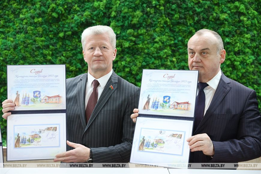 В фойе дома культуры состоялась церемония гашения государственного знака почтовой оплаты "Слуцк - культурная столица Беларуси". А на сцене учреждения Анатолий Маркевич передал сертификат "Слуцк - культурная столица Беларуси 2023" председателю Слуцкого районного исполнительного комитета Владимиру Гоге.