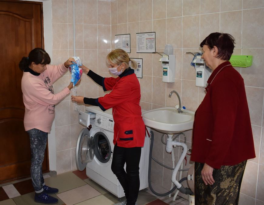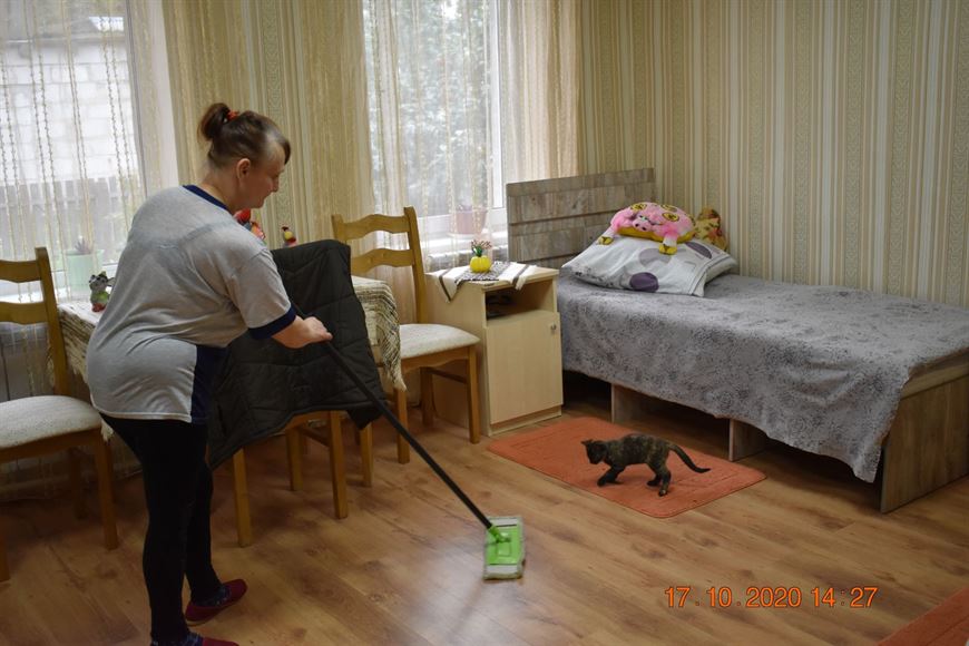 В Селютском доме-интернате трудотерапию проходят все из почти 160 проживающих. Это небыстрый процесс, занимающий несколько лет. "Прежде всего медицинский персонал дома-интерната обследует проживающих и определяет, кто из них сможет выполнять посильную работу и осваивать навыки самообслуживания. Проект по трудотерапии разделен на три этапа, которые длятся по году. На первом этапе инструкторы и медики проводят консультационную работу: рассказывают, что и как нужно делать, мотивируют, наблюдают, подготавливают к предстоящим работам, выполняют несложные действия. Второй этап предполагает непосредственно практическую часть. Проживающие под присмотром инструктора учатся не только готовить, но и другим полезным повседневным навыкам: уборке, стирке, умению пользоваться современными бытовыми приборами - стиральной машиной, микроволновкой, электрочайником, пылесосом и так далее. Третий этап становится своеобразной вершиной проекта по трудовой реабилитации. Это совместное проживание, когда подопечные дома-интерната селятся отдельно, в домах или квартирах, и могут устроиться на работу. В ближайшее время одна из проживающих нашего социального учреждения как раз перейдет жить в отдельный дом. Ей предоставят также должность технического работника. Специалисты дома-интерната будут навещать ее, курировать и помогать по мере необходимости", - рассказала инструктор по трудовой терапии Юлия Березина.