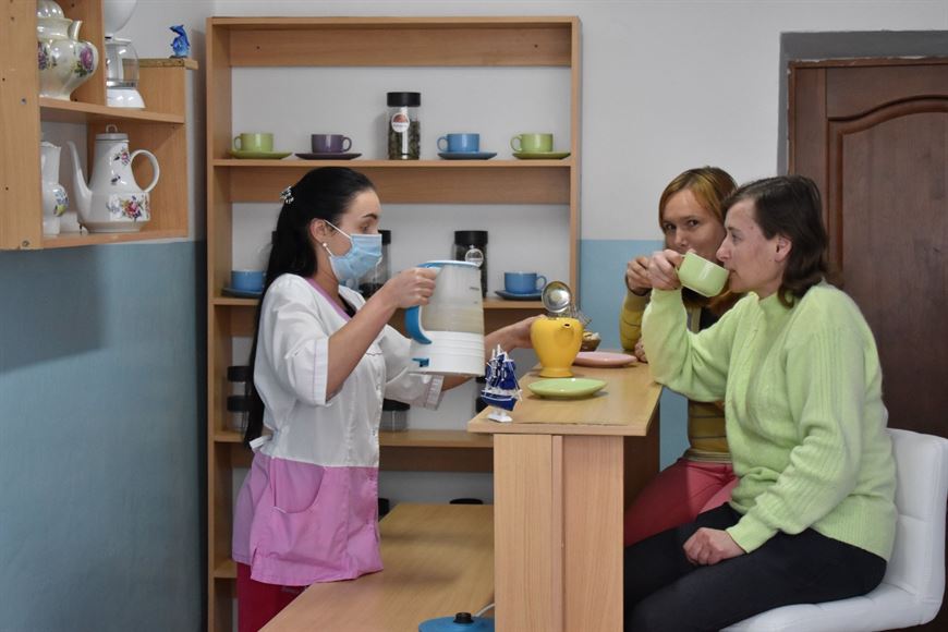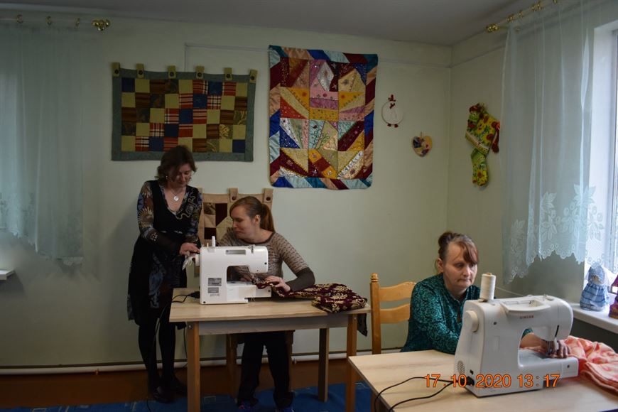 Прежде всего Татьяна Бондарь сообщила, что проживающие в доме-интернате проходят трудотерапию по различным направлениям. Это бытовые, сельскохозяйственные и даже промышленные работы. В доме-интернате изготавливают сувенирную продукцию, есть здесь свои теплицы для выращивания овощных культур и цветов, швейная и столярная мастерские.