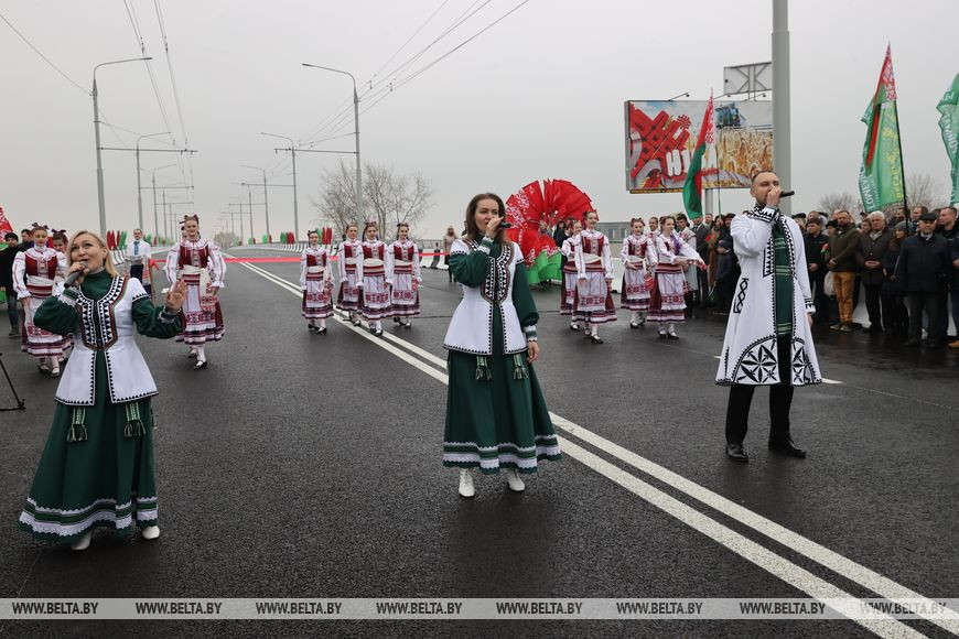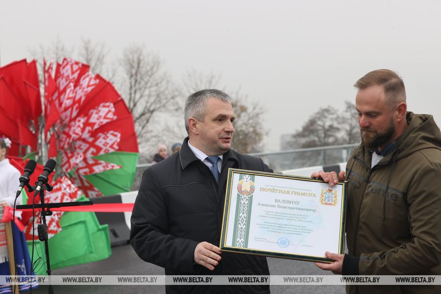 По словам Ивана Крупко, в области мосты после реконструкции открываются практически ежегодно. "Все помнят знаковый объект через реку Припять в Житковичском районе, который торжественно открылся с участием главы государства в 2018 году тоже к 7 ноября. В 2019-м возобновилось движение по полукилометровому мосту через Сож в Гомельском районе, в 2021-м поехал транспорт по мосту через Птичь в Октябрьском районе. Тогда же открыли и уникальный по конструкторскому решению мост через Днепр в Рогачевском районе", - перечислил на церемонии открытия важные объекты последних лет губернатор.