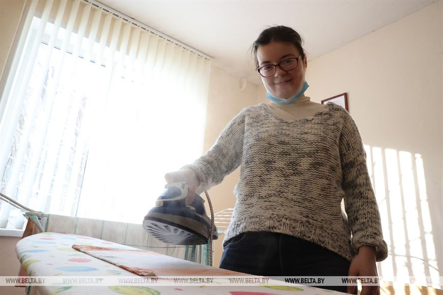 Пока другие "осваивают процедуры", шустрая Настя уже заканчивает вытирать пыль в комнатах и хвастается нам своей работой. "Пыль вытирала, пол мыла, пылесосила тут, готовила обед", - перечисляет она полученные навыки. Дома девушка тоже при деле: "Сама мою посуду, сама кушаю. И братикам помогаю, когда Янка, Юшка (Андрюшка. - Прим. БЕЛТА) дома".