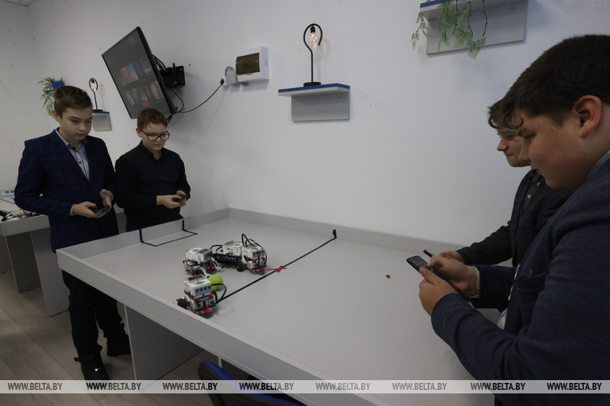 В день нашего визита в Полоцк в лаборатории робототехники занимались четверо парней - Емельян Бриль, Даниил Жуковец, Никита Карла и Даниил Гонтарев, из числа самых лучших и опытных юных инженеров. А в декабре они еще в рамках международного сотрудничества почти месяц бесплатно занимались с российскими педагогами из Ленинградского областного центра развития творчества одаренных детей и юношества "Интеллект", осваивали технологию разработки проектов.
