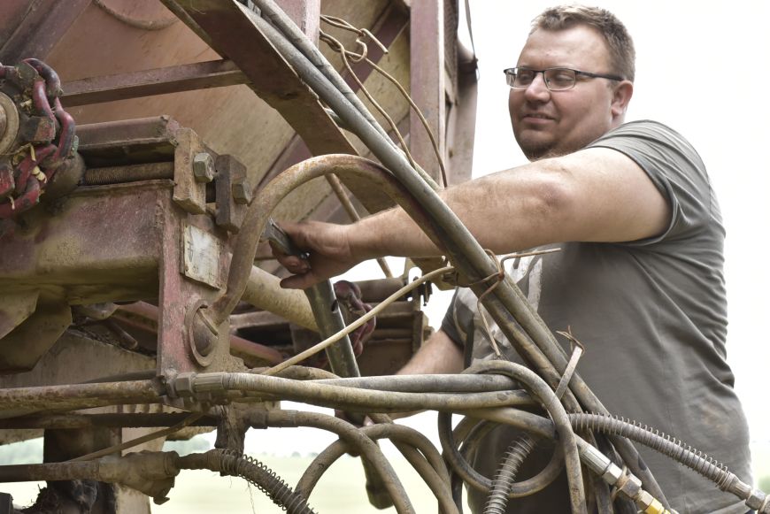 Застали мы механизатора на поле, где он удобрял травы для скорейшего роста, находясь за рулем самоходного опрыскивателя "Роса". Начинал в хозяйстве с вождения маленьких тракторов, затем перешел на комбайны, а сегодня ему можно доверять практически любой вид сельскохозяйственной техники.