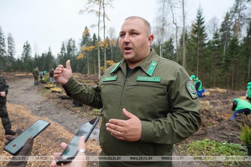 Сеянцы дуба и березы, а также саженцы ели пополнили участок площадью почти в гектар. Ранее работники леса провели здесь санитарную рубку, убрав зараженные короедом ели. Теперь на этом месте появится смешанный лес, который лучше приживается и уже становится более распространенным на территории Витебщины. "Дубы, как говорили наши деды и прадеды, любят расти в шубке, но с открытой головой, поэтому их по краям будут оберегать от ветров ели, а когда дубки поднимутся ввысь, их крона будет возвышаться над хвойными деревцами пышной шапкой. Березу садим для лучшего плодородия почвы. Сегодня на республиканском субботнике, с которым совпала акция "Дай лесу новае жыццё!", здесь высадят 4,5 тыс. растений - дуб будут высаживать с закрытой корневой системой, а ели и березу - с открытой", - рассказал журналистам главный лесничий Витебского государственного производственного лесохозяйственного объединения Александр Измайлович.