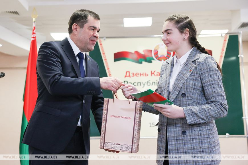 В Кобрин сегодня приехали 20 подростков со всей Брестской области. Среди них отличники учебы, победители спортивных соревнований, олимпиад и творческих конкурсов, волонтеры, общественные активисты. Губернатор поздравил их с Днем Конституции, вручил паспорта и экземпляры Основного закона. В свою очередь помощник Президента - инспектор по Брестской области Валерий Вакульчик попросил школьников быть достойными гражданами страны и гордиться тем, что они белорусы.
