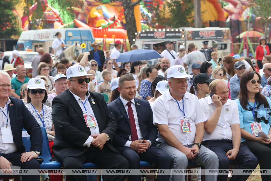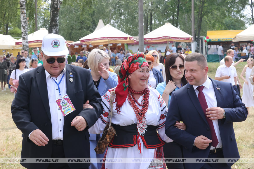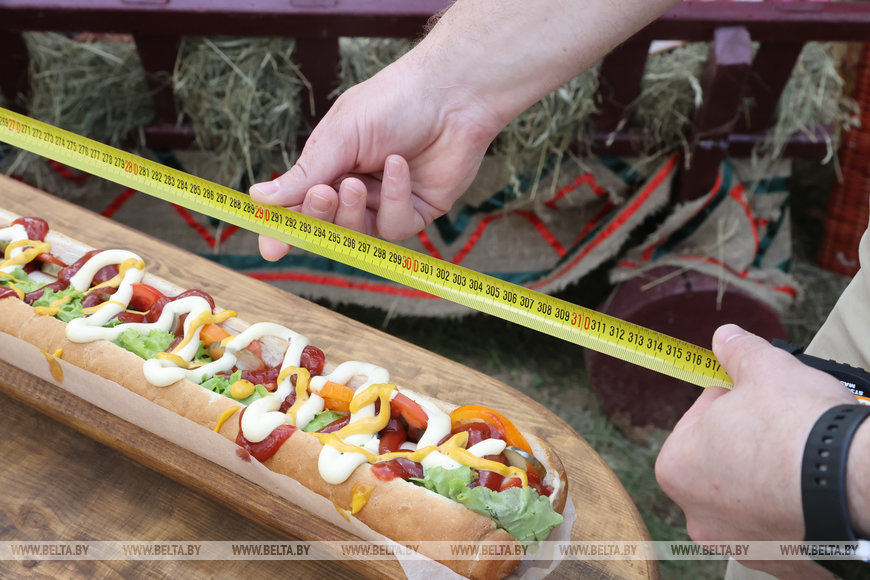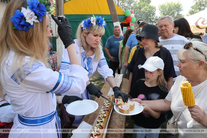 А вот житель Калинковичей Андрей Алексеевич стал одним из первых обладателей двух кусочков от гастрономического рекордсмена этого дня - трехметрового хот-дога от местного мясокомбината. "Пришлось немножко попотеть в очереди за этим угощением. Да, взял два кусочка, один - для жены, ее угощу сначала, обожду минут пять - и сам попробую, - заливается от смеха гость фестиваля. - Это шутка, конечно".