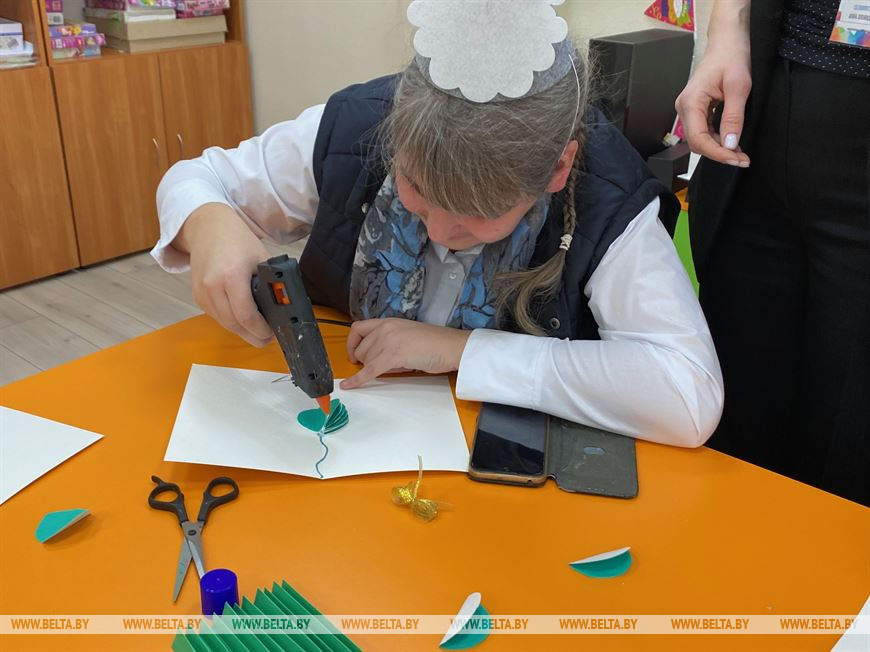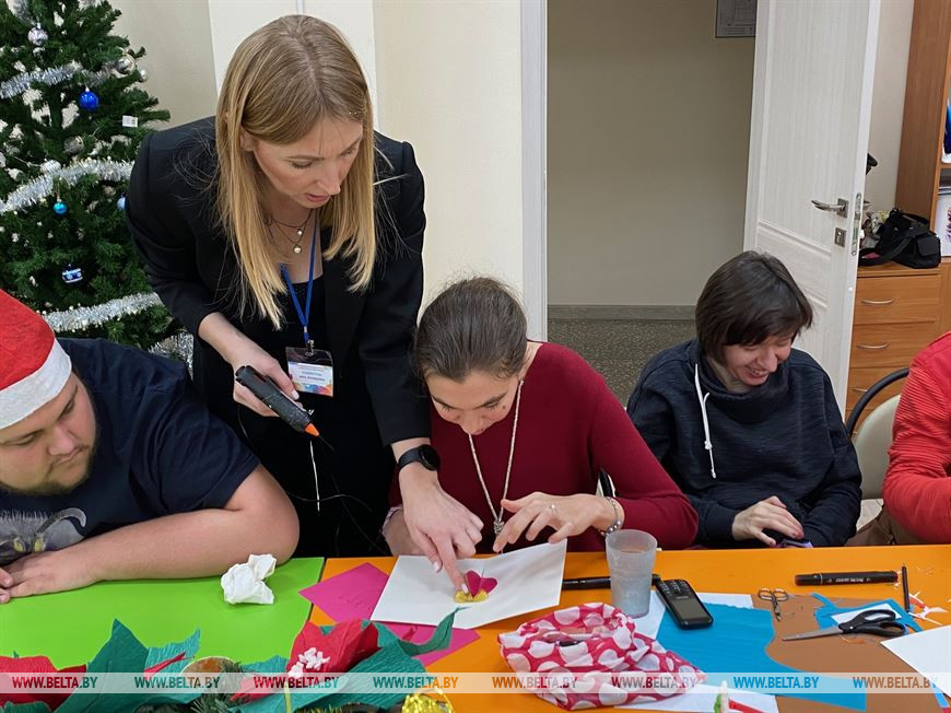 Сегодня занятия у посетителей отделений начались с подготовки красочных открыток. С энтузиазмом они резали, клеили и рисовали. Создавали объемные елочки и шарики из бумаги и подписывали свои творения. Наталья Романовская, одна из посетительниц отделения, рассказала, что очень рада поучаствовать в такой работе. "Я рада, что меня здесь учат новому", - отмечает она.