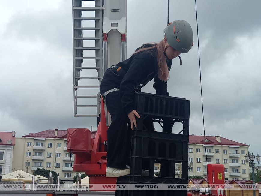 Восторг и аплодисменты вызвал маленький подвиг 10-летней Кати Лучковой из гродненской гимназии №3. Девочка без страха забралась на самую верхотуру, почти дотянувшись до стрелы и с комфортом, на страховом поясе спустилась на землю."Не страшно?" - поинтересовалась мы у верхолазки. "Почти не было страшно, - заверила Катя. - хотя я такое попробовала в первый раз. Тренируюсь на скалодроме, могу забраться на самый верх. Это и помогло".