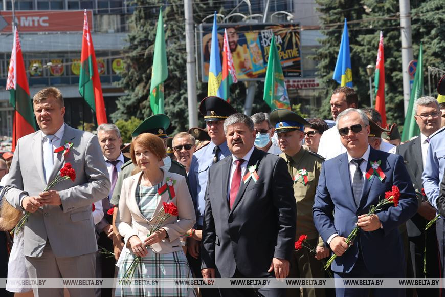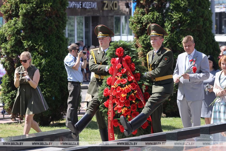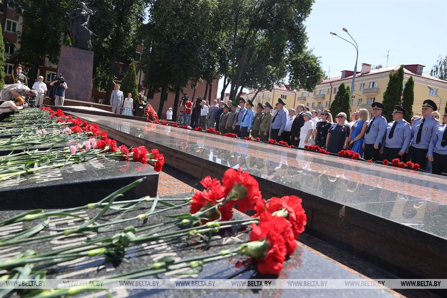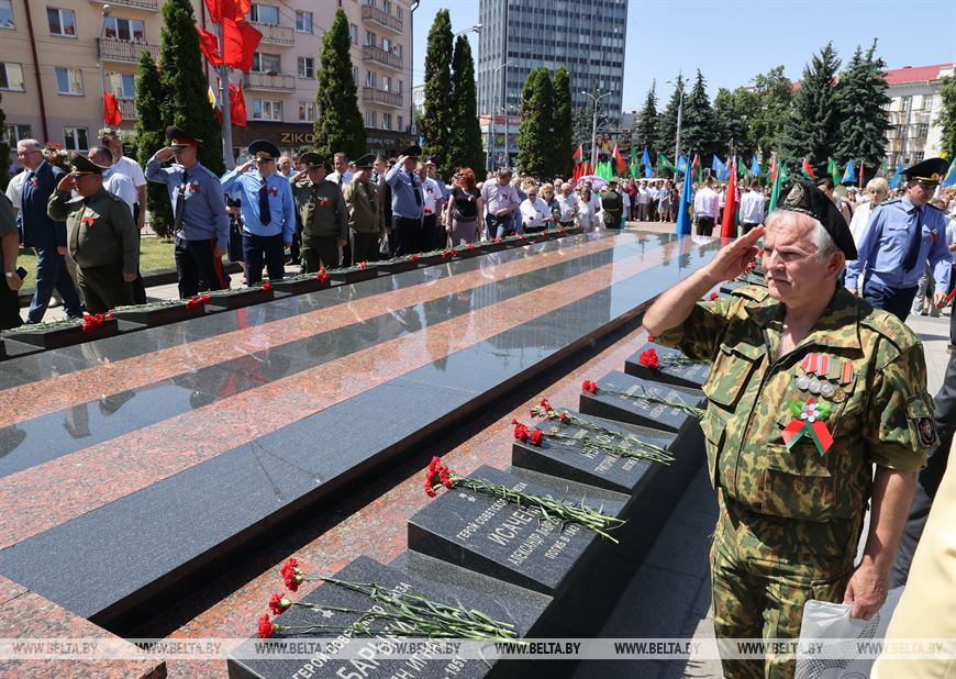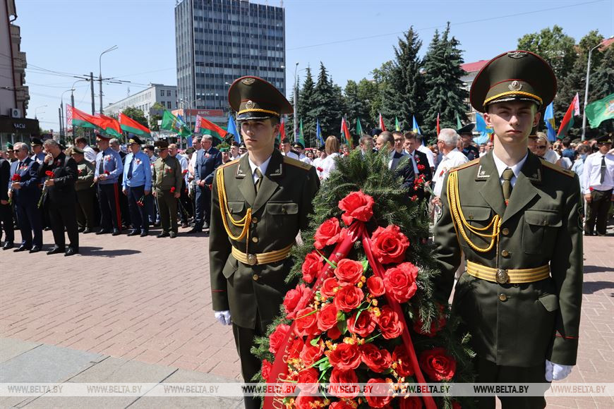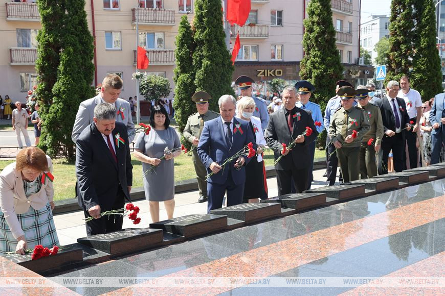 Возле Вечного огня на площади Труда собрались ветераны войны и труда, бывшие партизаны и подпольщики, труженики тыла, руководство области и города, члены Совета Республики, почетные граждане, воинские подразделения, представители трудовых коллективов, общественных организаций, молодежь.