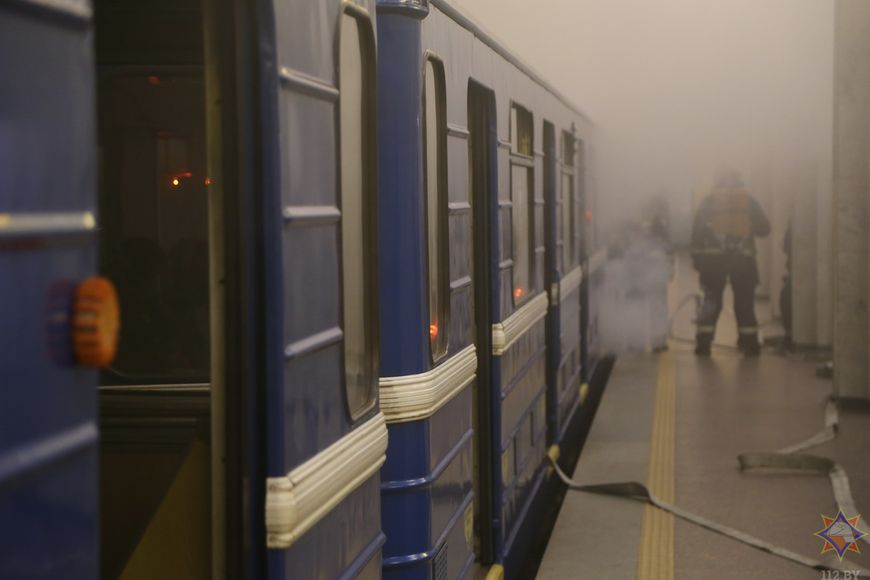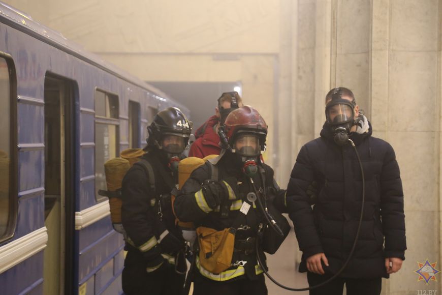 По легенде учений, из-за неисправности электрооборудования состава на перроне станции "Октябрьская" загорелись второй и третий вагоны. При пожаре выделилось большого количества дыма, от чего некоторые пассажиры пострадали. Четверо из них находились без сознания в соседних с горящими вагонах. При этом возникло плотное задымление на станции и в переходе между станциями "Октябрьская" и "Купаловская".