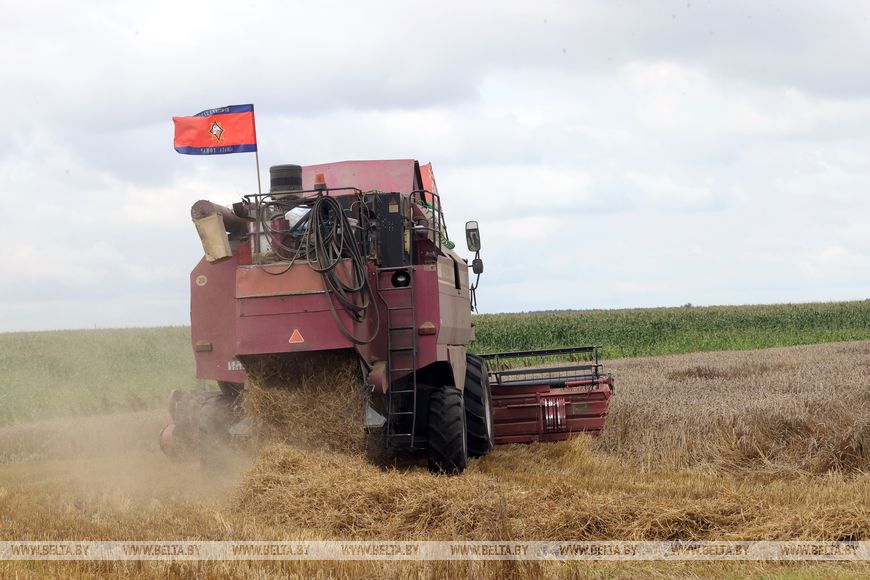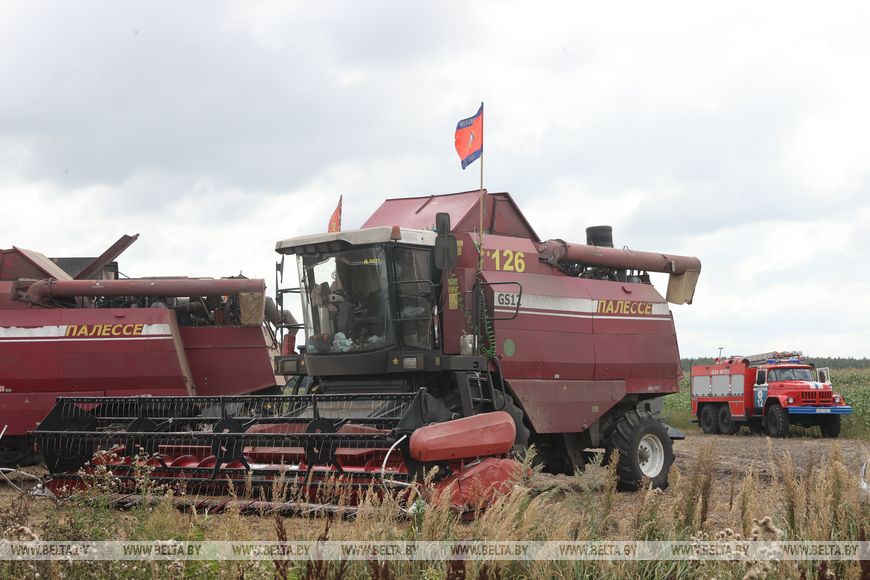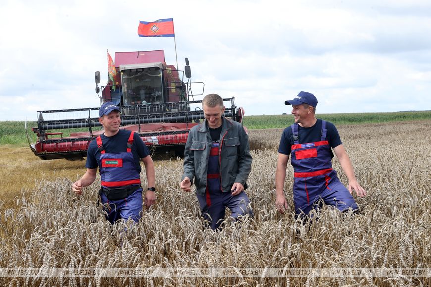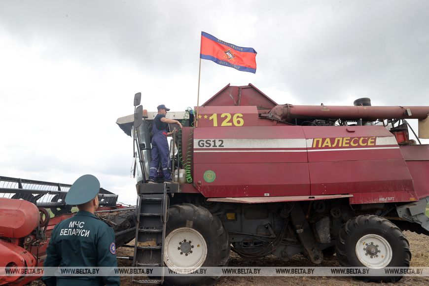 На бескрайних полях ОАО "Тихиничи" трудятся экипажи, в составе которых есть спасатели-пожарные. По золотому морю зерновых плавно лавируют комбайны.