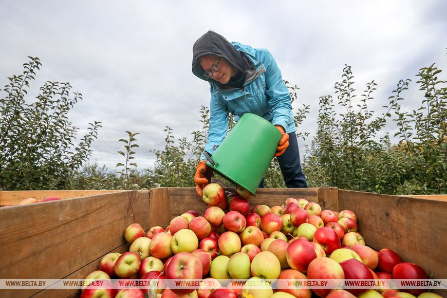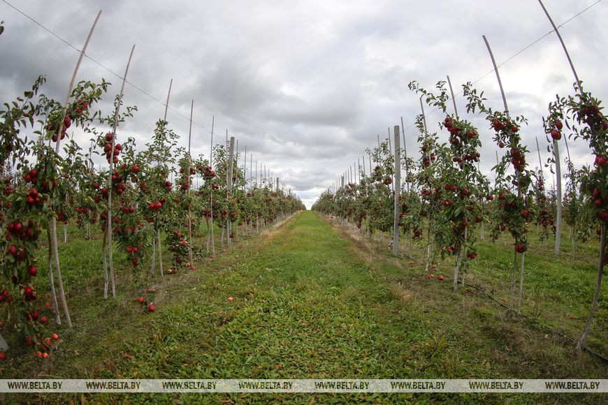 В "Остромечево" сады растут на 211 га, основная часть занята яблонями. Также в хозяйстве выращивают виноград белорусской селекции, черешню, вишню, сливу, алычу. "Выращиваем более 20 сортов яблок и белорусской, и зарубежной селекции. В этом году ожидаем получить около 2,5 тыс. т яблок. В начале ноября планируем закончить уборку урожая", - отметил бригадир.
