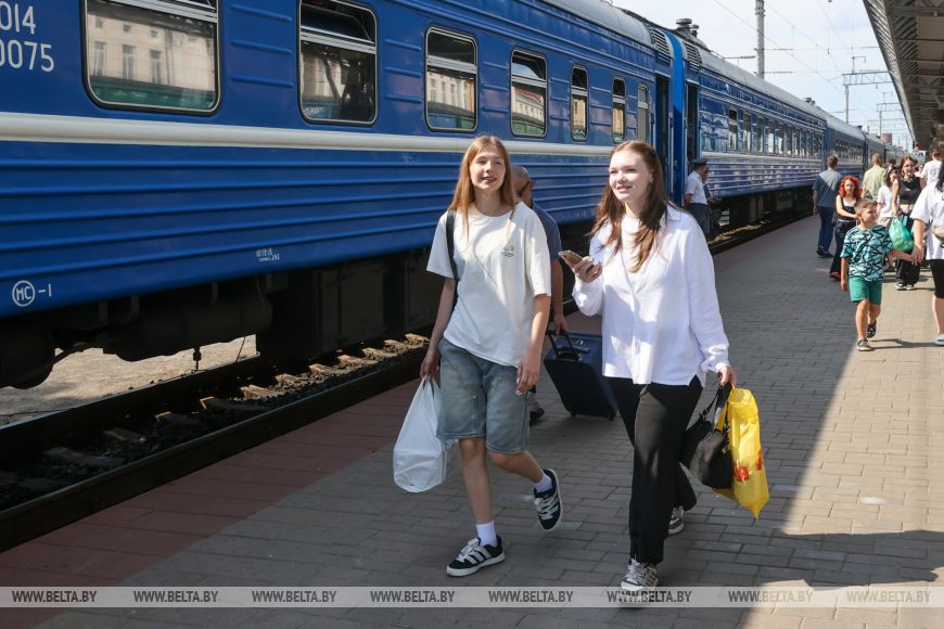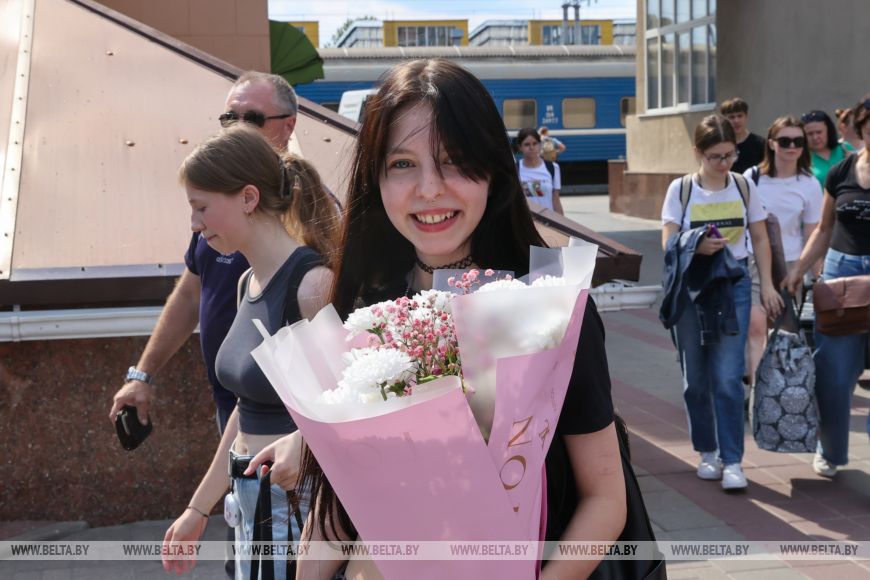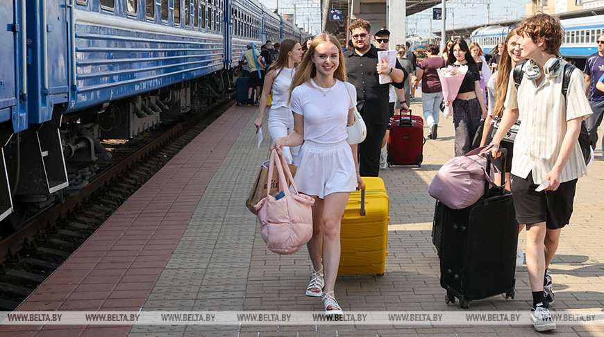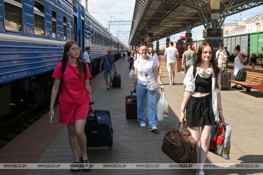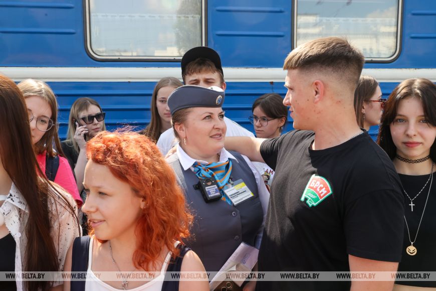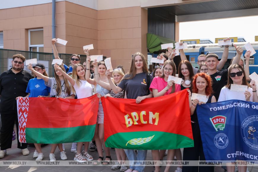 14 июля, Гомель /Корр. БЕЛТА/. Торжественная отправка студенческих сервисных отрядов "Чайки" им. Героя Советского Союза Владимира Гамзина и "Метеорит" им. Героя Советского Союза Сергея Мацапуры в детские центры и оздоровительные лагеря Российской Федерации прошла 14 июля в Гомеле на железнодорожном вокзале. Работать вожатыми и в качестве сервисного персонала будут более 30 гомельских ребят.-0-