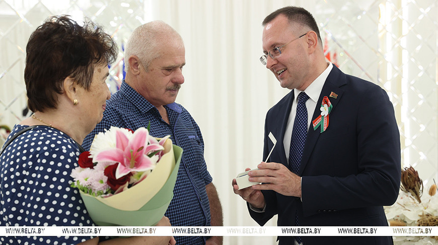 Церемонии чествования семейных юбиляров немного отличаются от классической регистрации брака. Сегодняшняя запомнится еще и тем, что почетным гостем на свадьбе стал председатель Брестского горисполкома Сергей Лободинский. Он поздравил пары и вручил им памятные подарки. Амулетом на счастье и удачу будет пуговица брестского фонарщика.