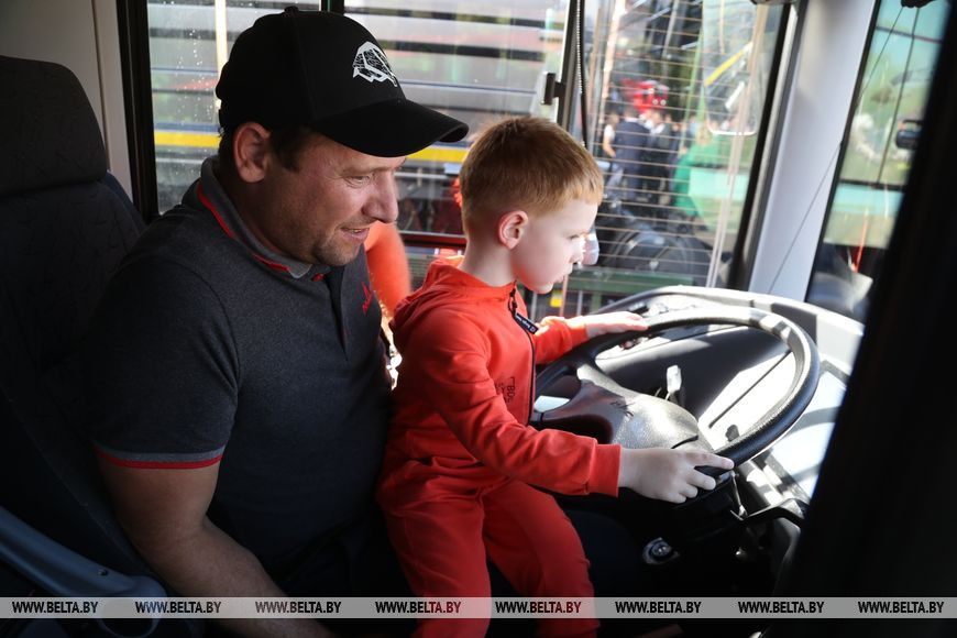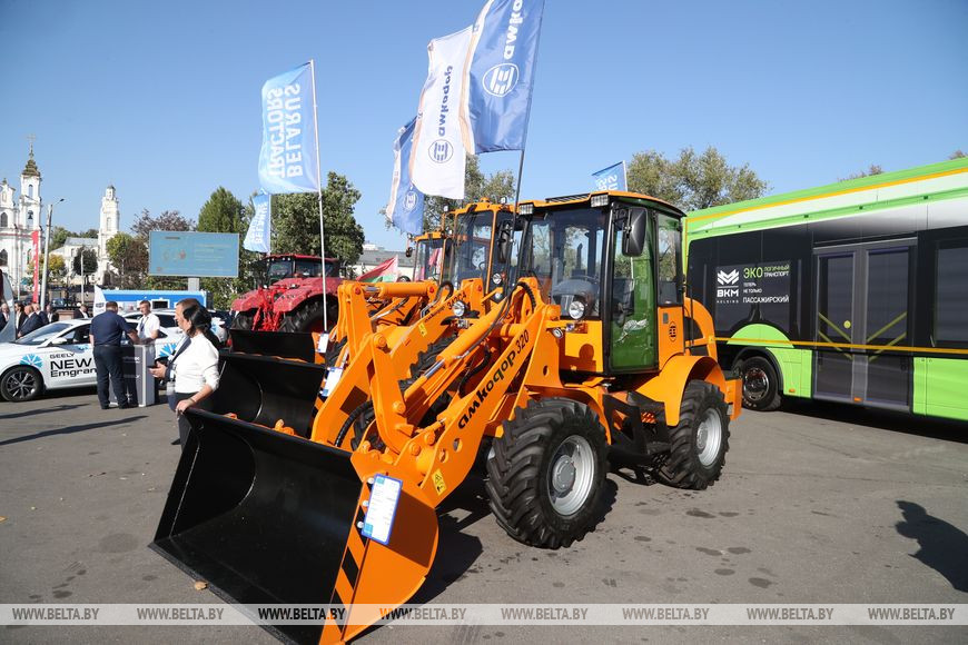 Крупногабаритная техника приковывает взгляды взрослых и совсем юных посетителей. Здесь комбайны "Гомсельмаш", тракторы МТЗ, автобусы МАЗ, автомобили "БЕЛДЖИ" и другие новые и обновленные отечественные машины. Желающих даже пускают в кабины и салоны, рассказывают, какие решения и научные мысли позволили создать такие новинки. Особое раздолье для малышей - у некоторых образцов периодически даже собирается очередь на своеобразный детский тест-драйв. Разумеется, суперэмоциональный. А фотозоной, помимо подготовленной организаторами, становятся любые крупные элементы техники. Две юные модницы даже умудрились устроить фотосессию в огромном ковше.